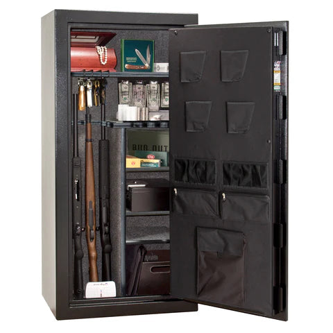 In terms of security, the Liberty Centurion 24 Gun Safe offers a defensive barrier of 4" wide military style locking bars - 6 times stronger in pry tests. The external re-locker provides additional punch protection, and the internal hard plate protects the lock from drilling attacks. Added steel gussets provides stronger rigidity to the door to increase pry resistance.